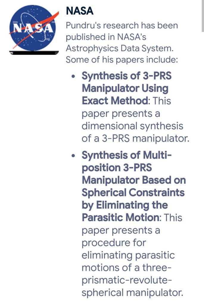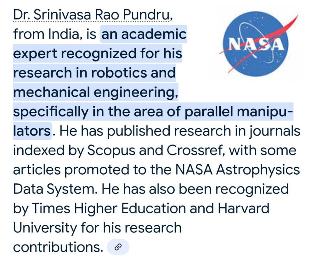Dr. Srinivasa Rao Pundru is a globally recognized academic and research leader, serving as an Academic Expert for the Times Higher Education World University Rankings for four consecutive years. His internationally indexed research featured across platforms such as Springer, Scopus, Crossref, NASA ADS, and Harvard focuses on advanced robotic systems and spatial parallel manipulators with real-world applications in aerospace, precision manufacturing, and automation. A frequent keynote speaker across major global academic forums and recipient of prestigious international research awards, Dr. Pundru emphasizes research integrity, global visibility, and long-term societal impact. He advocates for strengthening national development through the Research Leadership Index (RLI) and encourages young researchers to prioritize quality, ethics, and meaningful contribution over short-term recognition.